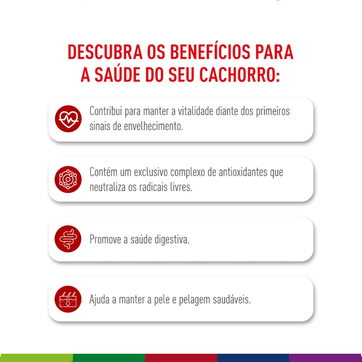 Conteúdo adaptado de nutrientes para ajudar a manter a vitalidade dos cães de porte médio frente aos primeiros sinais de envelhecimento. Contém um exclusivo complexo de antioxidantes para ajudar a neutralizar os radicais livres.