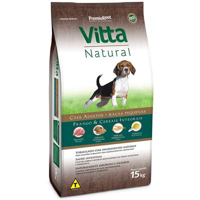 •A linha Vitta Natural é formulada com proteínas de alta qualidade e é enriquecida com todas as vitaminas e minerais necessários para que os cães vivam saudáveis e felizes. Elaborado com ingredientes naturais e cuidadosamente selecionados, o produto Vitta Natural Adultos Raças Pequenas Frango e Cereais Integrais, além de muito saboroso, não possui corantes e aromatizantes artificiais. Promove também a saúde intestinal, através da associação de fibras naturais com prebiótico, e auxilia para uma pelagem bonita, pela presença do ômega 6.