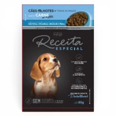 Receita Especial ao Molho cães filhotes sabor carne é um alimento especifico para todas as raças. Rico em proteínas, vitaminas, minerais e fibras, feito com ingredientes naturais para uma nutrição equilibrada. Alimento sem transgênicos, sem aromatizantes e conservantes artificiais.