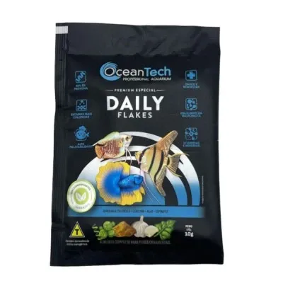 Oceantech Daily Flakes é um alimento completo e balanceado, formulado para atender as necessidades nutricionais das mais diversas espécies de peixes ornamentais em aquários comunitários. Sua formulação possui proteínas de origem animal e vegetal de alta qualidade, fornecendo a qualidade necessária de aminoácidos para o desenvolvimento dos animais. Isso torna o alimento mais nutritivo e palatável, evitando sobras no fundo do aquário. O alimento Daily Flakes possui ingredientes funcionais, como astaxantina, a cenoura e o espinafre que são fontes de carotenoides naturais e que ajudam a ressaltar a coloração vibrante dos peixes, proporcionando escamas mais brilhantes.