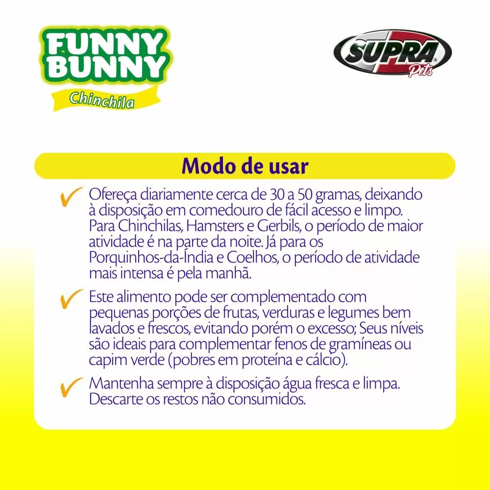 Ofereça diariamente cerca de 30 a 50 gramas, deixando à disposição em comedouro de fácil acesso e limpo. Para Chinchilas, Hamsters e Gerbils, o período de maior atividade é na parte da noite. Já para os Porquinhos-da-Índia e Coelhos, o período de atividade mais intensa é pela manhã; Este alimento pode ser complementado com pequenas porções de frutas, verduras e legumes bem lavados e frescos, evitando porém o excesso; Seus níveis são ideais para complementar fenos de gramíneas ou capim verde (pobres em proteína e cálcio); Mantenha sempre à disposição água fresca e limpa. Descarte os restos não consumidos.