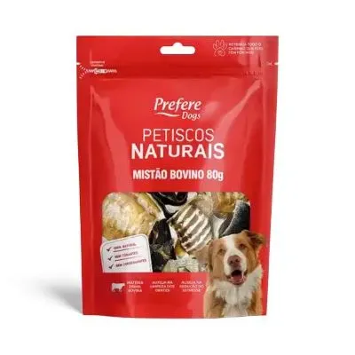 O Petisco Mistão Bovino Prefere 80g é um petisco natural para cães da marca Prefere, feito de matéria-prima bovina desidratada (como esôfago, bexiga, etc.), sem corantes ou conservantes, que ajuda na limpeza dos dentes e reduz o estresse, sendo uma opção saborosa e saudável para seu pet.