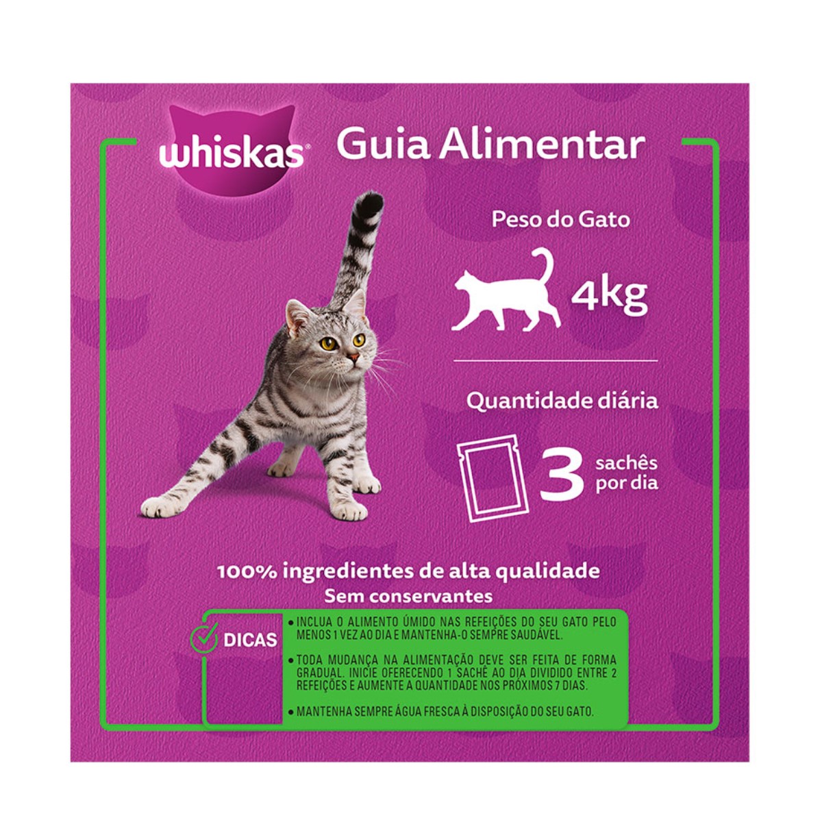 Sirva 3 sachês por dia para gatos adultos de 4kg.Você pode adaptar a quantidade de alimento de acordo com a idade e o nível de atividade do seu gato. Cada sachê de WHISKAS® equivale a 1/4 de xícara de WHISKAS® seco (1 xícara = 200 ml).
