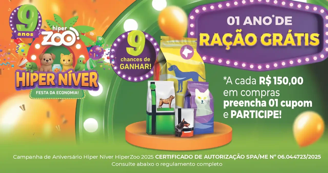 As imagens de produtos são meramente ilustrativas. Consulte o regulamento completo em www.hiperzoo.com.br/regulamento2025. Promoção válida apenas para compras nas lojas físicas no período de 01.10.2025 à 09.11.2025.